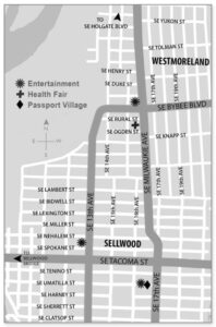 • The Passport Village gives you a chance to meet some of the people and businesses who are outside the main walking area of Sellwood.  Look for the big inflatable Oregonian Puppy, and listen for the music coming from the Passport Village stage all day.
