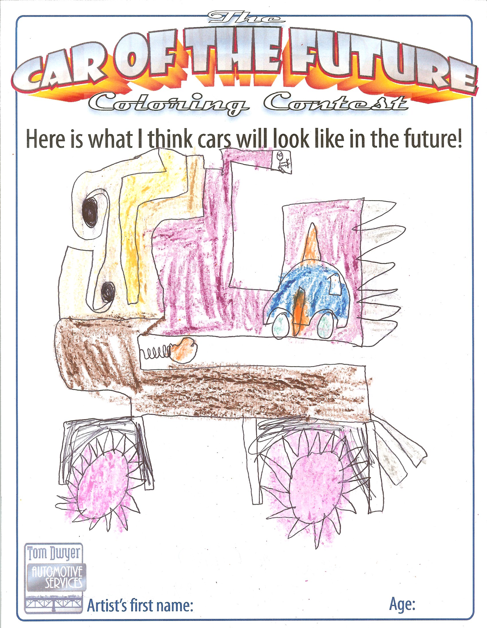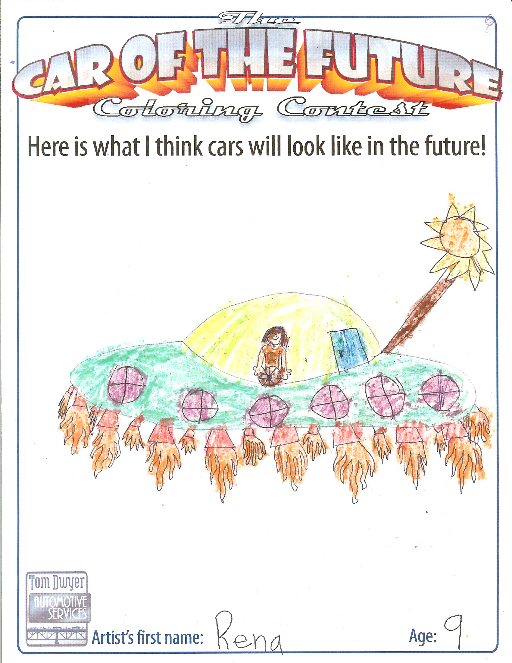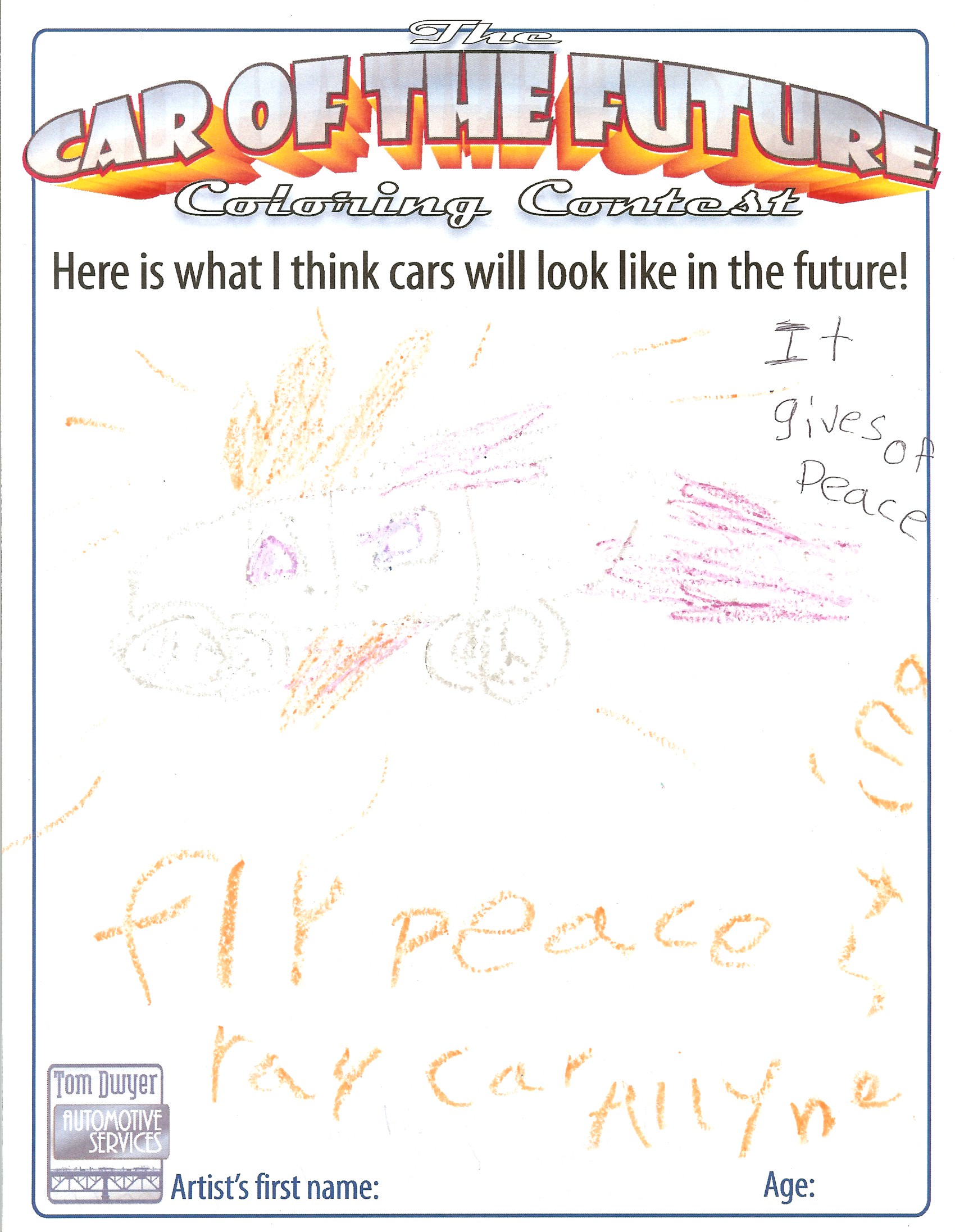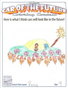 And first place this year goes to Ally, for her “Flying Peace Ray Car”. Ally took environmentalism to the next level by designing a car that doesn’t just “not pollute”, it actively makes the world a better place with a peace ray that “gives off peace”. A nice feature in any car!