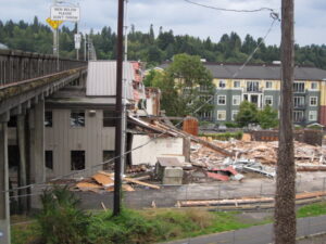 destruction part of the construction, as the first batch of condos on the Northeast side of the bridge are beginning to come down.