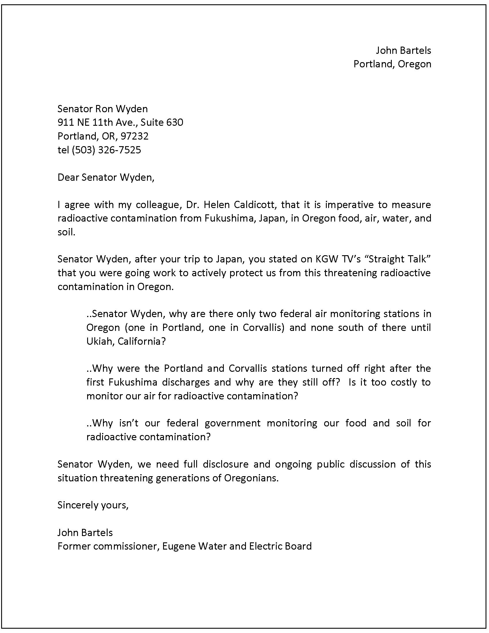 to Senator Ron Wyden about the ongoing and grossly under-reported Fukushima disaster.