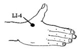 • Acupuncture point large intestine-4 or LI-4, located in the web of skin between the thumb and index finger on the right hand.