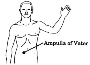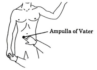 • The area where the gallbladder bile duct and the pancreatic bile duct meet before dumping into the small intestine (also called the Ampulla of Vater) is located 11/2 in. to the right of the bellybutton and then 3 in. below that.
