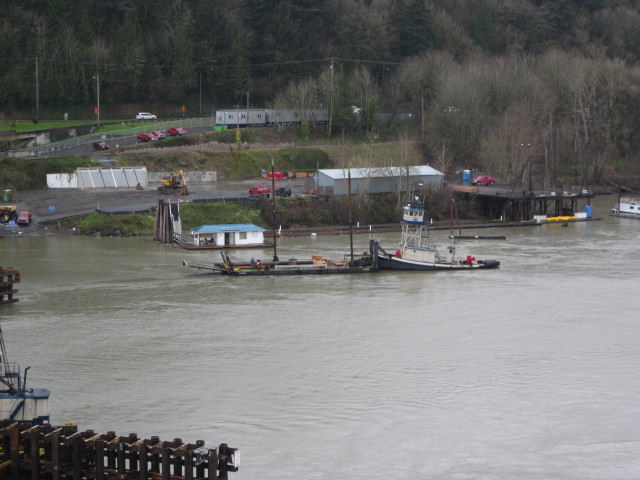 In-water construction is on hold, but that just means stuff that will disturb the river bottom. Surface and land work are still going on, as this picture of a tugboat moving construction platforms in front of the ex-Staff-Jennings site show.