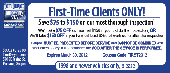 If you’re reading this then you’re probably already a Tom Dwyer client. Our First Time Client Offer might not be useful to you, but if you’d like to share our service with family or friends it can be a big help. For most new clients we recommend our Comprehensive Inspection so we can establish a baseline condition for their vehicles. This coupon takes $75 off the cost of that inspection, and we’ll waive the other $75 if the user has a minimum amount of work done. Our First Time Client Offer is a great way for anyone get started on the road to coherent vehicle maintenance… the best way to save money in the long run!