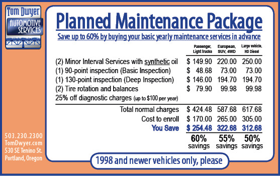 Because planned, coherent maintenance is so important to the life and performance of your vehicle, we designed our Planned Maintenance Package to encourage exactly this type of sensible planning. It lets you buy your full year’s vehicle maintenance needs up-front. You save at least 50% on all the basic maintenance services you’ll need throughout the year, including oil changes, tire rotations, interval service inspections and more. You save the most money of any of our savings programs but, more importantly, because the maintenance items you’re getting are so critical to the reliability of your vehicle, you’re getting the most value.