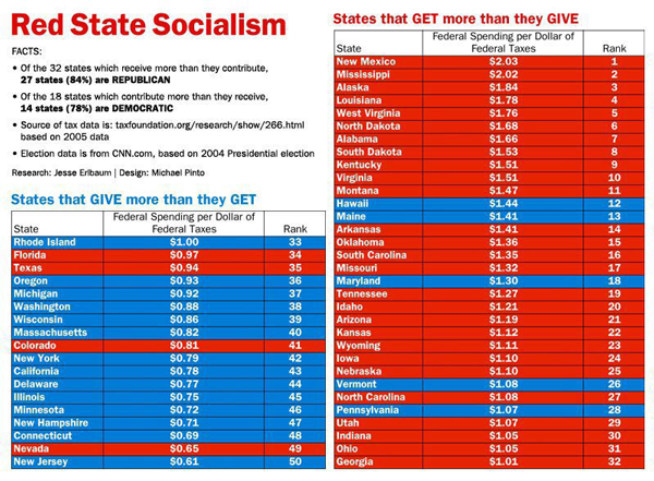 When it comes to federal spending, all states are not created equal. Some states receive far more federal money than they’ve paid in federal taxes. A whopping 84 percent of the states that get back more than they pay in taxes are Red states. Year after year, the people in these states elect Republican candidates who bash the “moochers” in our country, never realizing that they’re suckling off the Blue teats themselves. But now, finally, there may be a way to correct this imbalance…