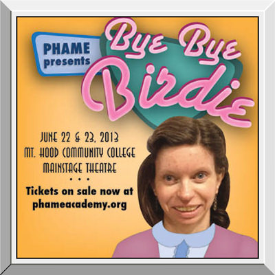 Not to overstate the matter, but PHAME Academy is everything good about Portland wrapped up into one enthusiastically musical, toe-tapping, inspirational, exuberant package. Founded by Carol Stady in 1984 to offer developmentally disabled people an alternative to Special Olympics, PHAME remains the only program of its kind in the country. It focuses on music, theater, and art, but also offers classes in creative writing, songwriting, yoga, and much more. We’re proud to have been associated with PHAME for many years, and very proud to invite you to their 2013 production of “Bye, Bye, Birdie”, opening June 22 at Mount Hood Community College Mainstage Theatre…