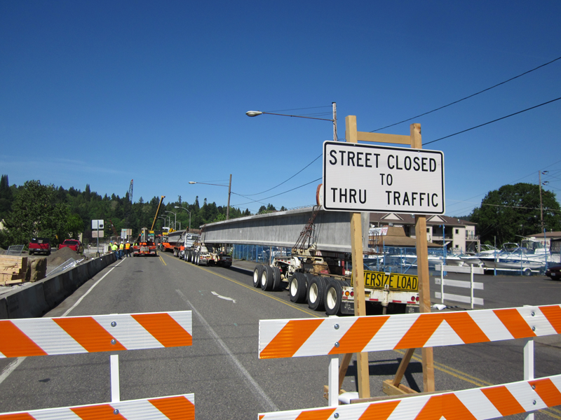 The third bridge closure went according to the pattern set so far… the inconvenient closure happens, the work goes smoothly, and the bridge opens ahead of schedule. It’s a slightly unexpected, but very nice pattern to have for a gigantic, complex construction project! To relive the golden moments of the support installation we bring you these photos of our own, and we’d also like to direct you to David Ashton’s excellent article on the episode for the Sellwood Bee, the local paper that’s been following the Bridge reconstruction from the very first public meetings.