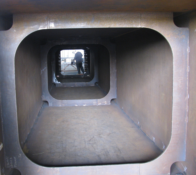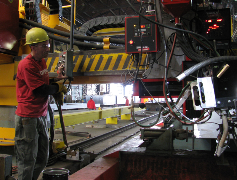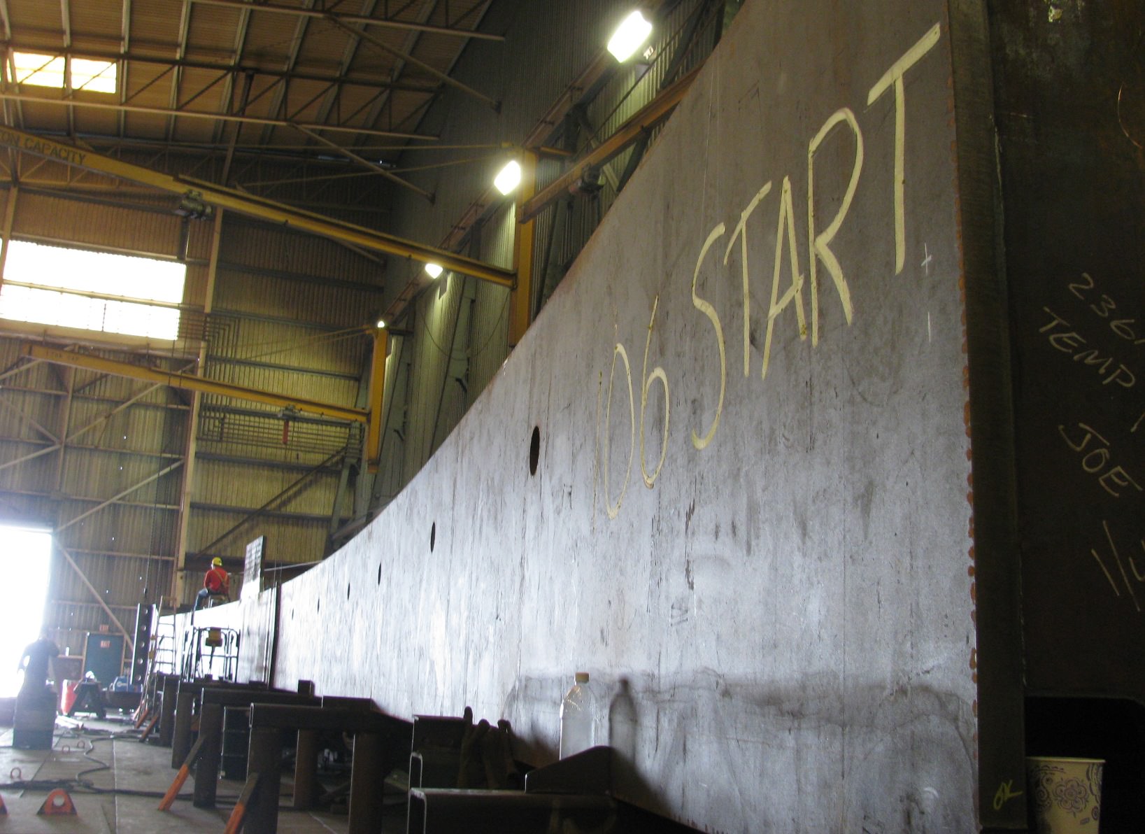 With the supports in place, we’re beginning to get feel for what the new bridge will look like. One of the next major visual changes will be when the gigantic steel arches are put in place. Those arches are already under construction at Thompson Metal Fab in Vancouver. Each arch rib is about 300 feet long and weighs 400 tons. They are so heavy that a naval architect will need to develop the plan for loading them in sections onto a barge, to ensure the barge remains stable. The folks at the Sellwood Bridge Replacement project brought us a look at just how titanic these arches will be…