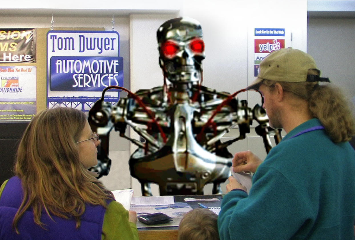 “It was hard saying goodbye to all the old guys, but we had to keep up with the times. These new Robotic Service Advisors are the wave of the future.” So said Tom Dwyer, owner of Tom Dwyer Automotive Services, about his shop’s latest technological upgrade. “Our clients know to expect respectful human contact from people who care about their needs and know their vehicles. They’re used to advice in their interest, not our shop’s bottom line. Well, no more of that! Replacing caring human Service Advisors with these profit-driven behemoths means money, money, money for us… and there may be something in it for our clients, too. Let me think…”