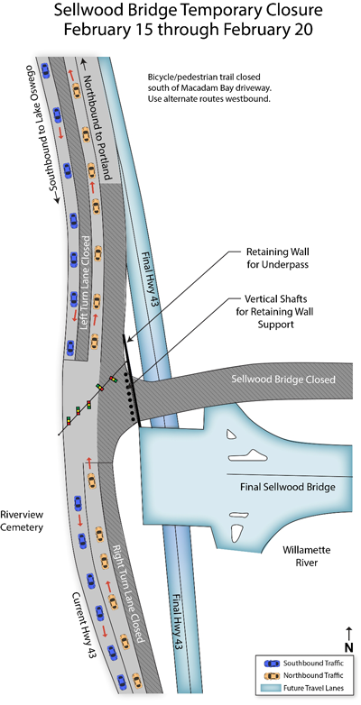 Hwy. 43 weekday lane closures:  The outside southbound lane of Hwy. 43 is closed weekdays (except from 4 p.m. to 7 p.m.) between SW Taylors Ferry Road and the project limits south of the bridge while the contractor works on retaining walls. A northbound lane is also closed weekdays from 9 a.m. to 4 p.m. north of the bridge due to work on the retaining walls. The City of Portland has adjusted the traffic signal at the west end of the bridge to improve traffic flow.