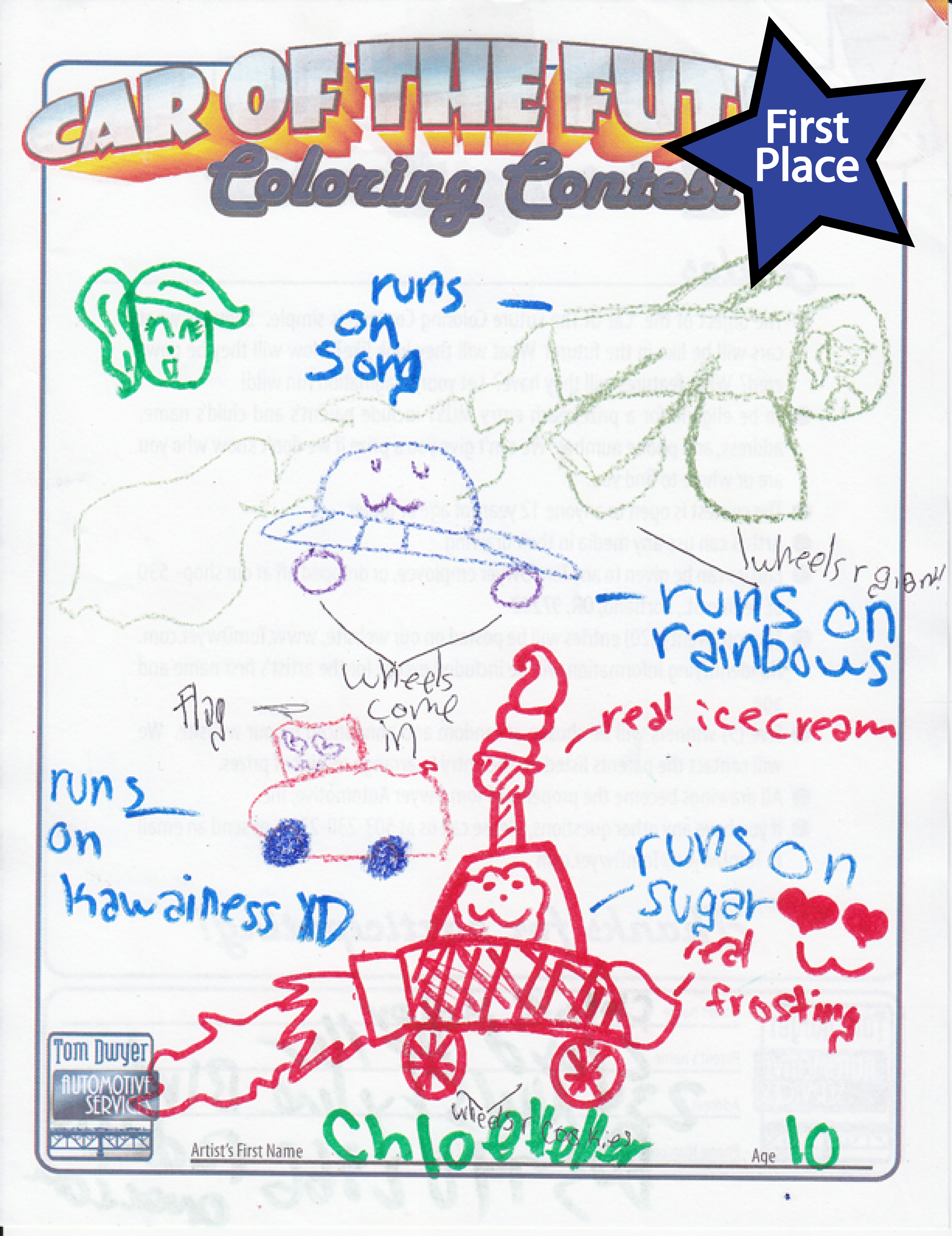 Chloe H., 10, took First Place this year with her deep consideration of alternative fuels… her cars run on sugar, song, and rainbows, but that’s not all… one runs on “Kawainess”. We thought that was a misspelling of some kind (and we spent quite a bit of time trying to figure out what she was trying to spell) until we looked it up online… it’s chiefly related to Japanese culture, and means the quality of being kawaii; cuteness. An under-utilized fuel, indeed!