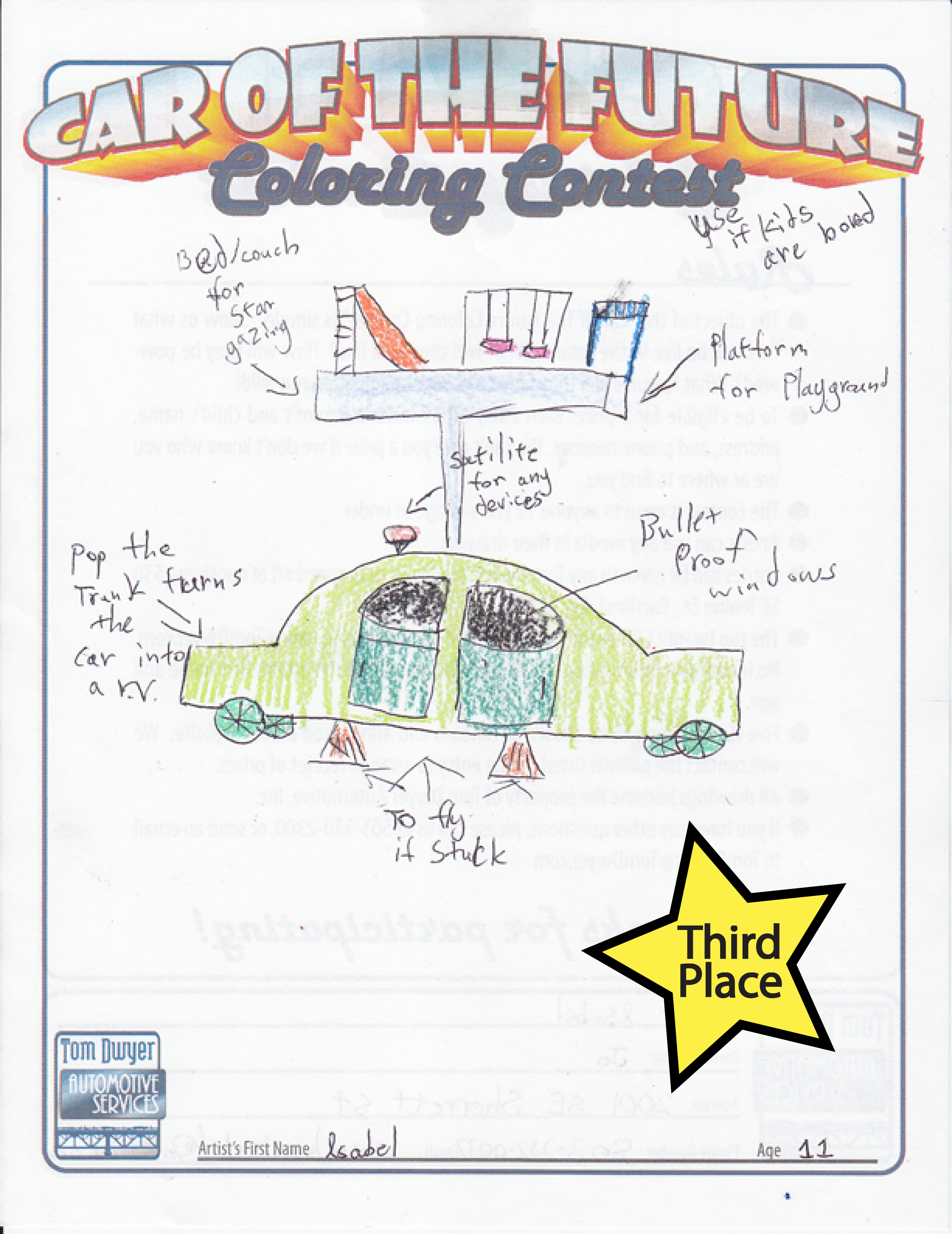 Our Third place prize of $10 went to Isabel, age 11, who doesn’t settle for DVD players in the back seat. Her sleek little sedan has an entire pop-up playground for “use if kids are bored”!