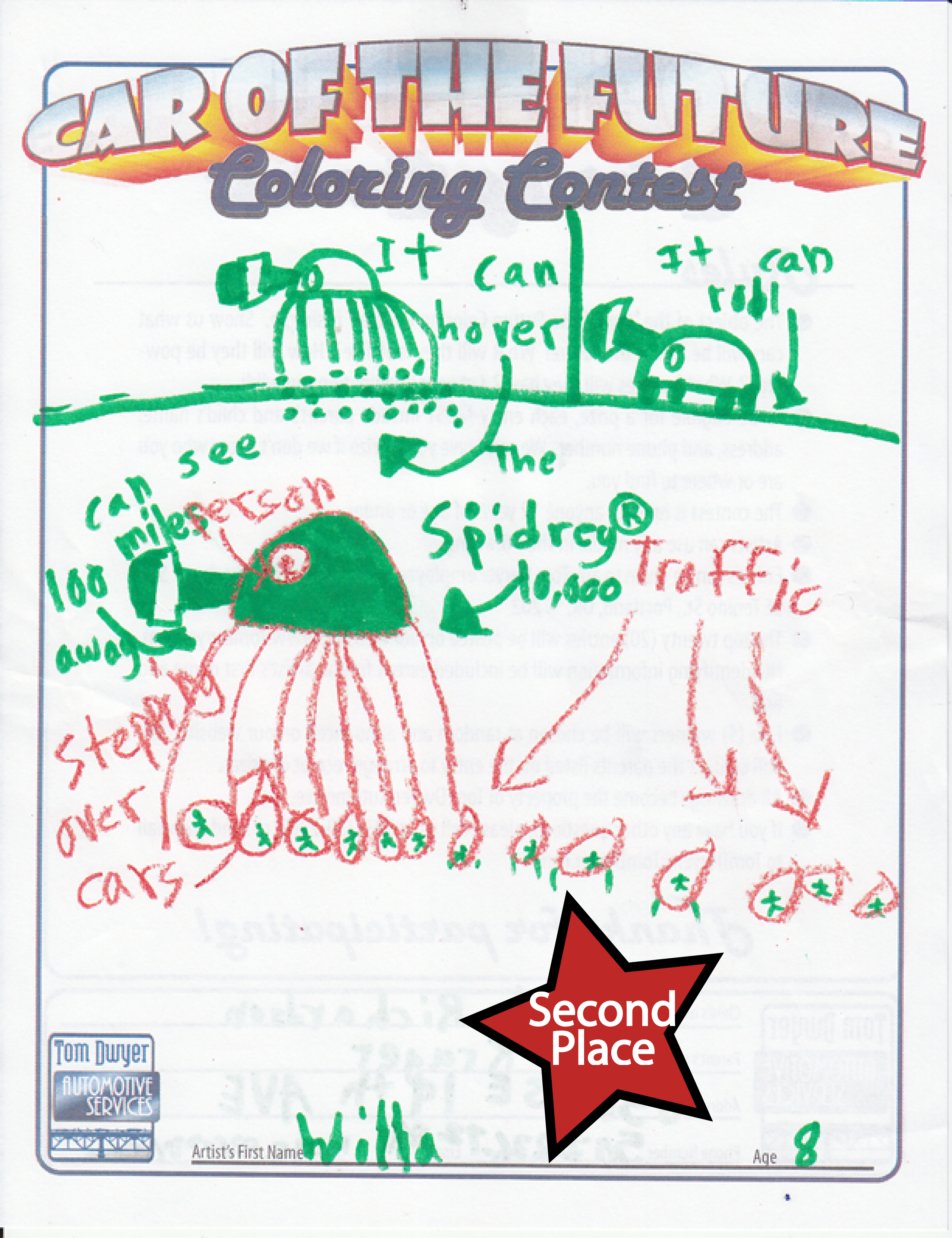 Second prize went to Willa, age 8. For all the entries, hers was the only spider car. The “Spidrey 10,000” is never caught in traffic… not only can it hover, but it can step over cars on its extendable spider-stilt legs.