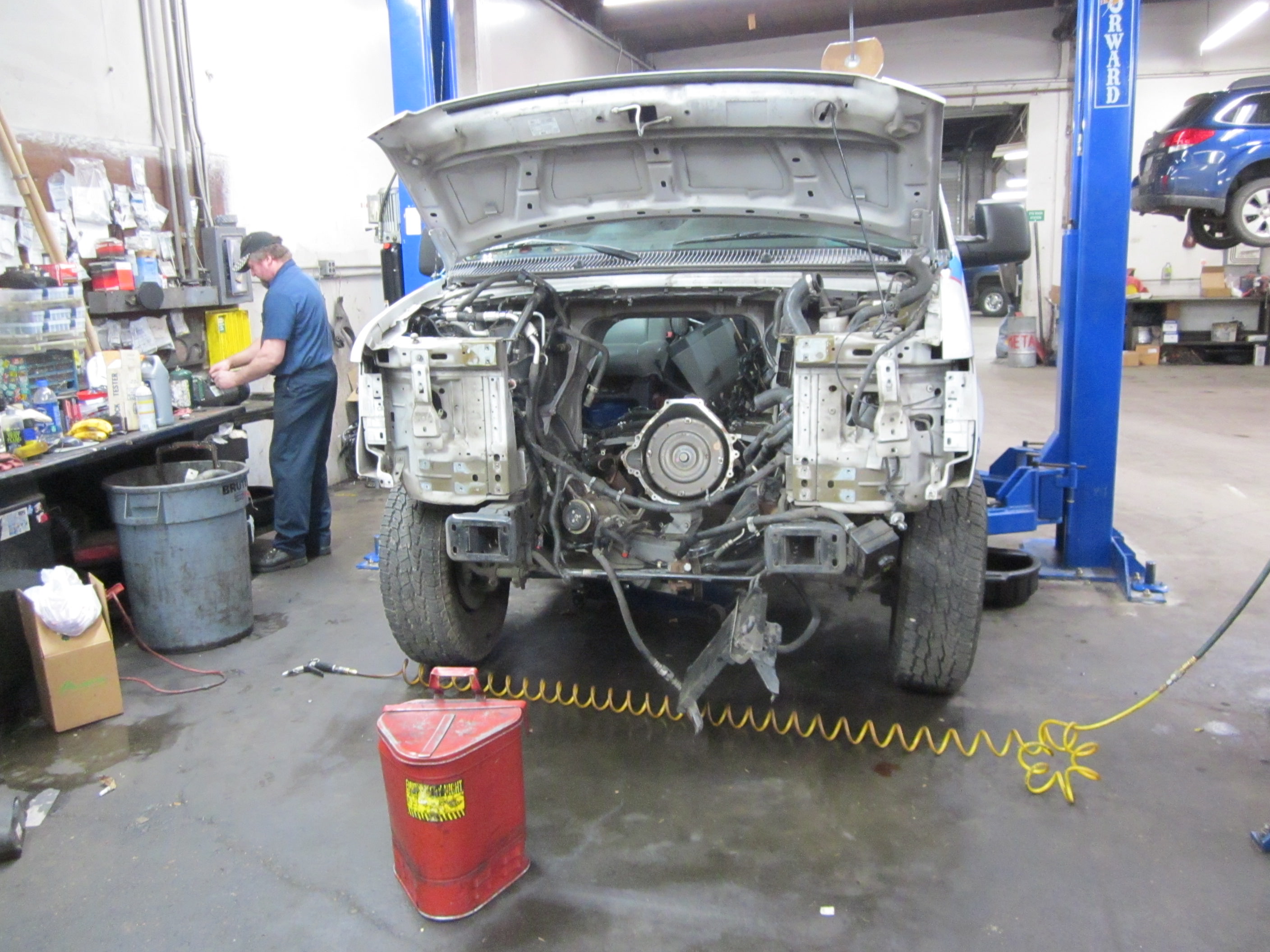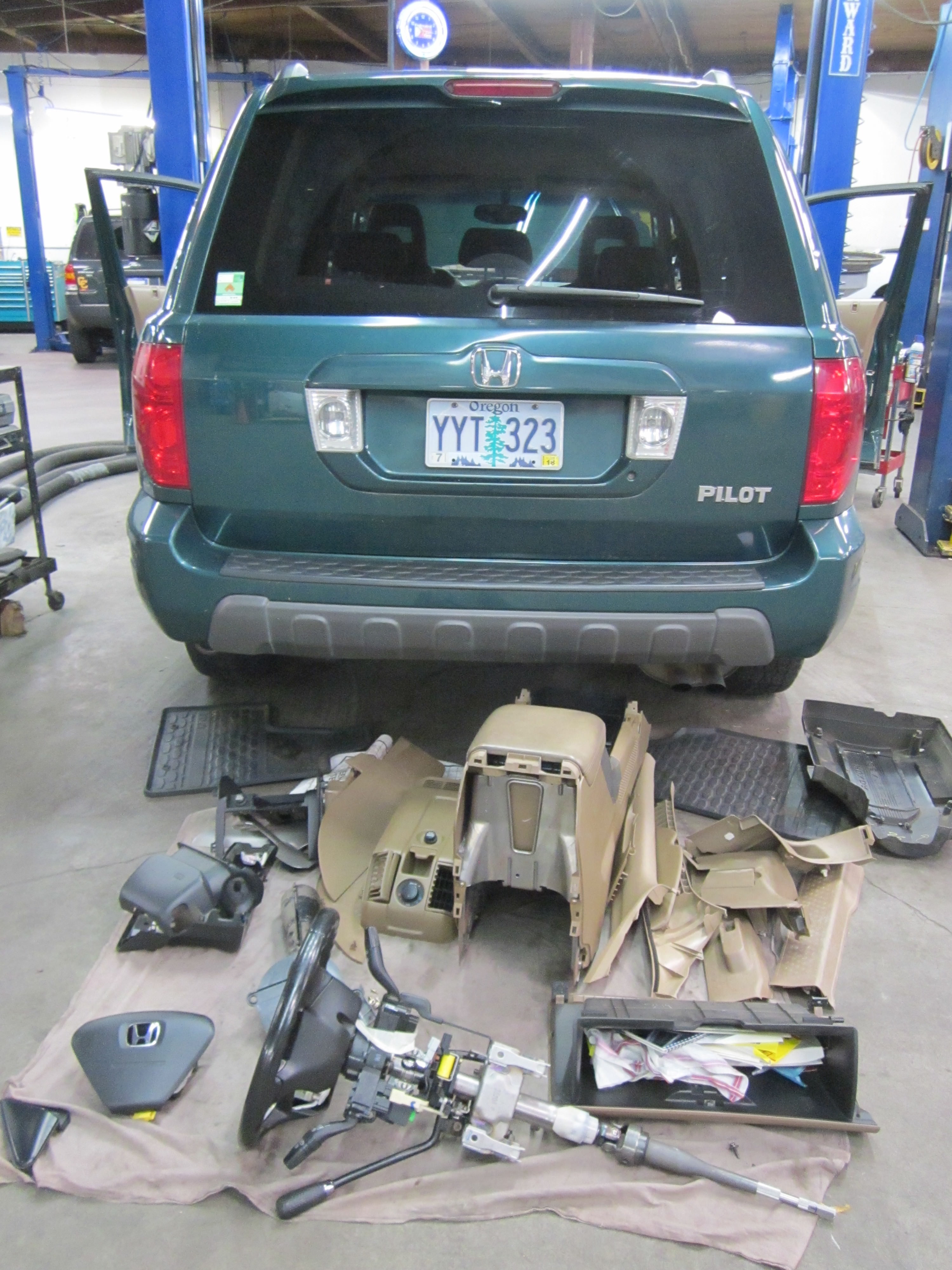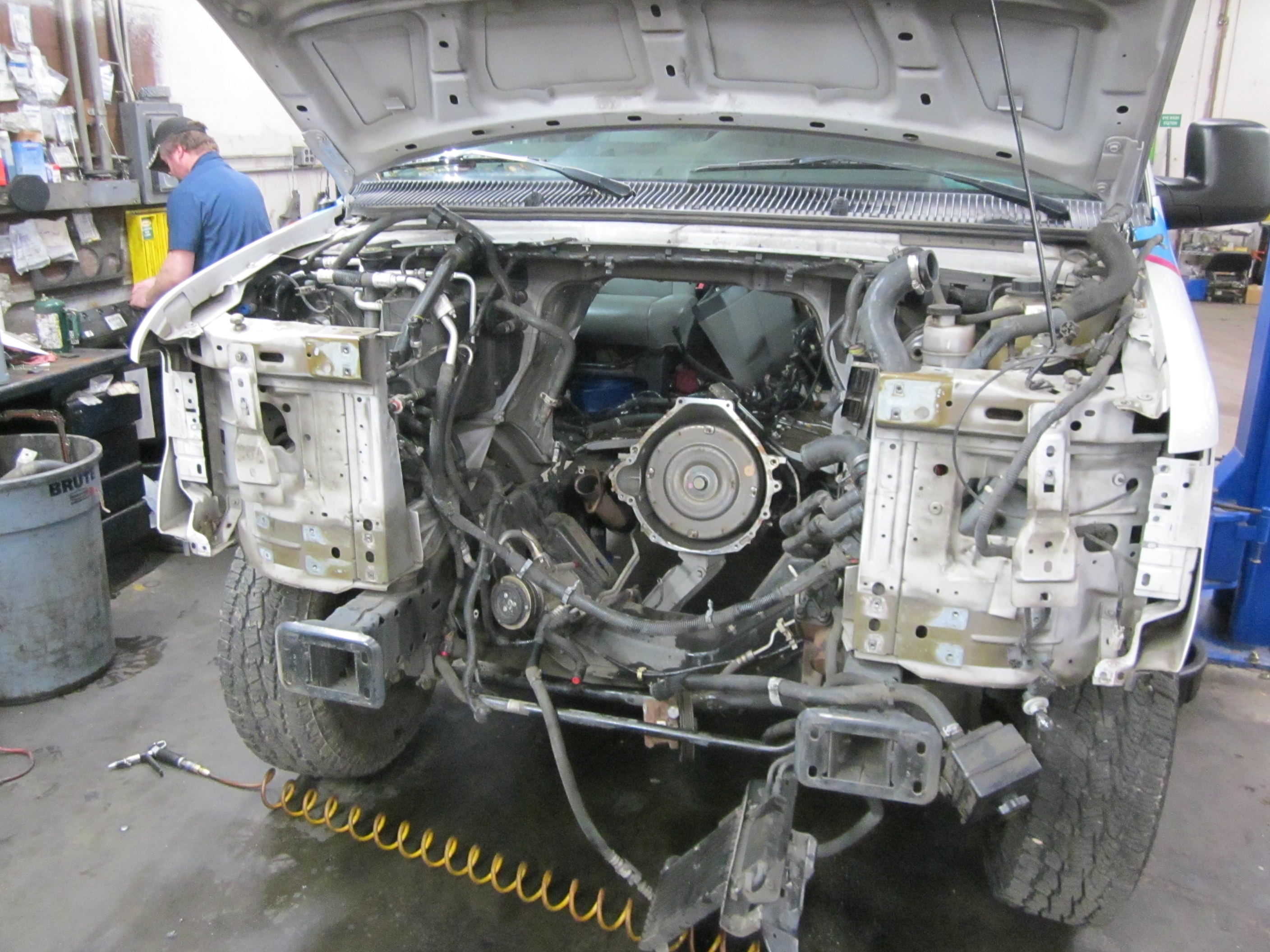 Before moving to the uniquely ghastly we’ll start with the commonly awful… this is what we have to do to your vehicle when we repair things deep inside the engine compartment. The top pictures show a van in for an engine replacement. The second set is even worse, showing the dismembered body of a Honda Pilot in for a heater core repair. Why worse?