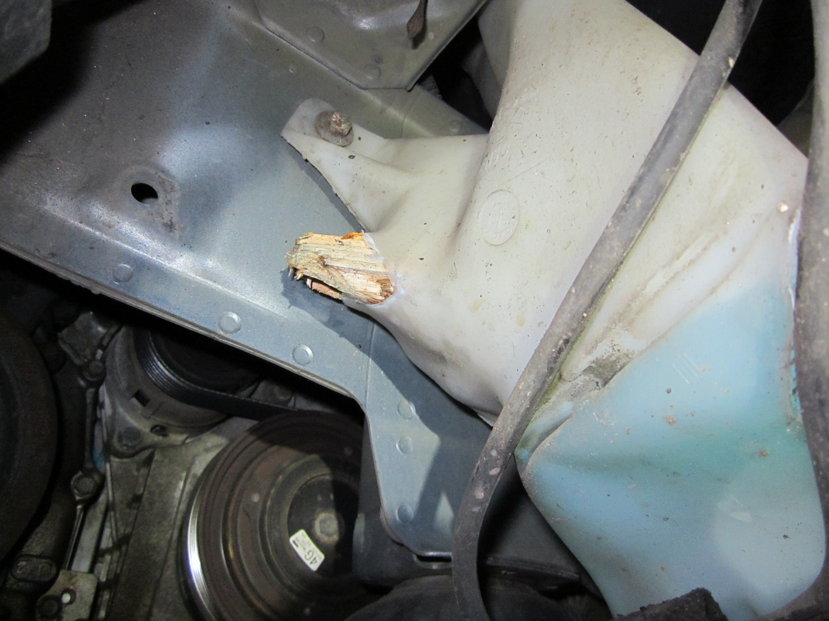 If you’re a rat, your dream house is something dry, warm, and safe from predators. Unfortunately, that also describes a car’s engine. We occasionally find rats, mice, chipmunks, and other little furry creatures that have made a bad choice in real estate and paid for it with their lives. Here’s one that briefly made its home behind the vehicle’s bumper. Not much to say about this other than it’s vaguely interesting and that odd smell from your vehicle may not always be mechanical.