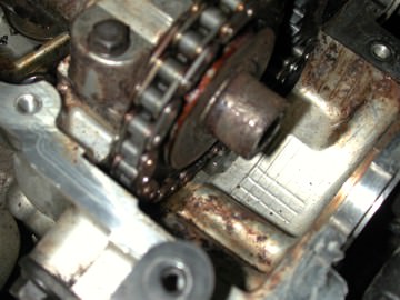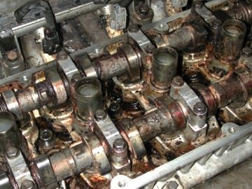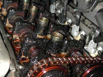 Over the miles, the engine oil had broken down into its basic parts and formed a tar-like black sludge that coated the entire engine. The first two pictures show the top of the engine with the valve cover removed. The sludge had packed the engine such that the engine parts and oil had to fight through the goo in order to move. The second picture shows just how thick that goo was… that screwdriver is stuck into the sludge about 1½ inches!