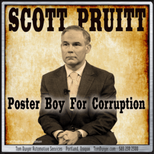 Let’s start by pointing out that we didn’t decide to pick on Scott Pruitt because he’s necessarily “the worst” of the Trumpets, but because he’s pretty representative of the caliber of them all. We could have picked Jeff Sessions, Steven Mnuchin, Betsy DeVos, Ryan Zinke, KellyAnne Conway, or virtually any of Trump’s other lackeys and compiled just an atrocious list as Pruitt’s, but Trump didn’t pick any of them because they cared about their agencies or had experience, in fact quite the opposite. From among the dwindling number of people willing to have their names associated with his, Trump uniformly picked people who actively opposed their agency’s missions and whose only qualification was eager pliability to the industries they regulated. Scott Pruitt is an ideal representative of the Trump Team; the ‘poster boy’, if you will. So let’s take a good look at the poster…