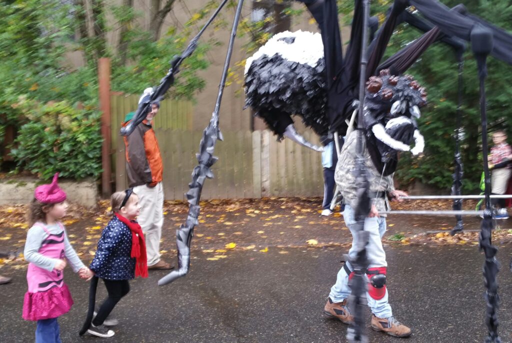 The most important step to meeting Boris (or staying as far away from him as you possibly can) is knowing where he’ll be.  He’ll be arriving at OMSI in his titanium-reinforced transport cage on Friday afternoon, and Saturday the doors open and the carnage fun begins. Portland Mini Makers Faire runs Saturday & Sunday, September 15 & 16, 9:30am-5:30pm at OMSI, 1945 SE Water Ave in Portland.  Tickets are still available at $16 for adults (14-62), $10 for youth (3-13), $10 for seniors (63+), and OMSI members receive 50% off.  Scroll on down for pictures of Arachno Giganticus at the Sellwood Monster March, and click here to see all the other Makers that will be waiting for you at the Faire!  See you there!