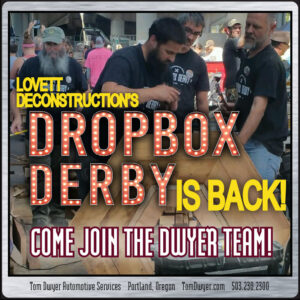 Many things may come to mind when you think about “auto mechanic”, but “skilled woodworker” probably isn’t one of them. Tom Dwyer’s “Mechanics” set out to change that by entering the 2018 DropBox Derby last year… they didn’t succeed. But hopefully they added phrases like ‘creative’, ‘engaged’, ‘community-minded’, and ‘always willing to participate in a fun activity that benefits a good cause’. Lovett Deconstruction’s DropBox Derby is returning for its 3rd year in 2019, and the Tom Dwyer “Mechanics” will be there again to stretch the definition of what a auto shop is.