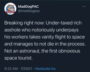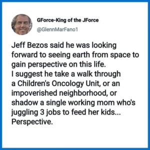 There’s value in sending regular people into space, but a billionaire is not a regular person.  Apollo astronauts were awed by their experiences in space, speaking of the unity of humanity, the delicacy of the planet, and the humbling knowledge of mankind’s place in the cosmos.  Not Bezos, whose revelatory idea was “…to take all heavy industry, all polluting industry, and move it into space.”  Space is not, and can never be, a magic dumping ground for Earth’s problems.  We can no more ‘move polluting industries’ into space than we can move 9 billion people to space stations if our biosphere collapses.  The Apollo astronauts’ lessons touched us all because the astronauts realized ‘we’ are all in this together.  A billionaire’s wealth divorces them from the needs, wants, and fates of regular people.  ‘Common humanity’ is a lesson they can never learn, and can never be part of their plans.