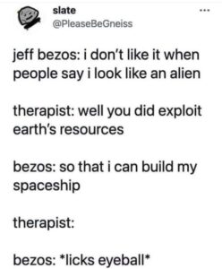 I desperately want to be excited, thrilled, and proud that we’re getting back into space but I’m ambivalent at best, and it seems I’m not alone.  The Billionaire Space Race isn’t a story of human achievement as much as a cancerous breakdown of an economic system.  When Bezos returned, he thanked “…every Amazon employee and every Amazon customer because you guys paid for all of this.”  52 years earlier, to the day, Neil’s immortal words were “One small step for a man, one giant leap for mankind.”*  Maybe that’s the crux of the problem.