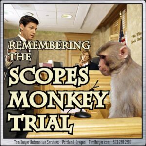 (from NPR)- “Eighty years ago, in July 1925, the mixture of religion, science and the public schools caught fire in Dayton, Tenn. The Scopes trial – or “Monkey Trial“, as it was called – dominated headlines across the country. The trial lasted just a week, but the questions it raised are as divisive now as they were back then. NPR looks back at the Scopes trial, the events that led up to it and its aftermath.”