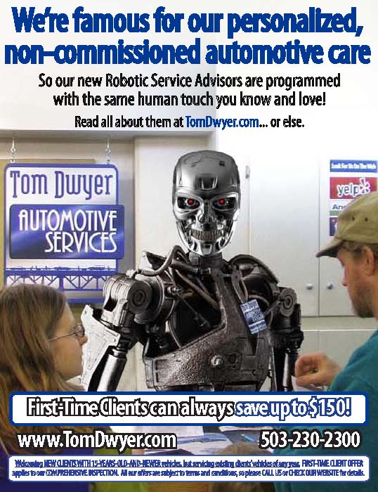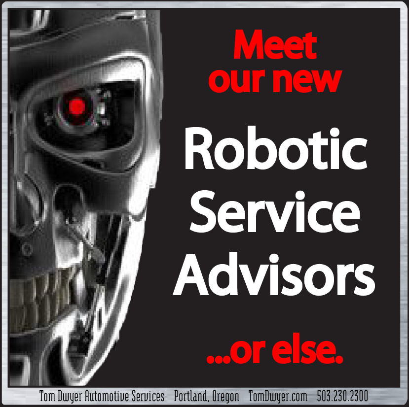 “It was hard saying goodbye to all the old guys, but these new Robotic Service Advisors are the wave of the future.” So said Tom Dwyer about Tom Dwyer Automotive Service’s latest technological upgrades. “Our clients expect respectful human contact from real people who care about their needs and know their vehicles. They’re used to advice in their interest and not our shop’s bottom line. Well, no more of that touchy-feely stuff! Replacing caring human Service Advisors with these profit-driven behemoths means money, money, money for us! There may be something in it for our clients, too. Let me think…”
