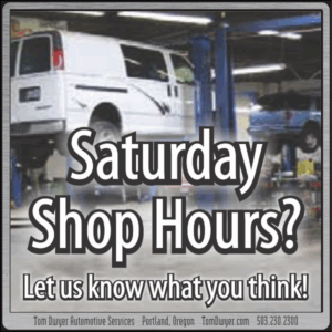 If you’ve ever called us to ask about vehicle service on a Saturday, you’ve heard our Service Advisors’ standard answer… “We’re open 10am to 1pm for pickup and dropoff, but we don’t have any Technicians available”. That may be about to change. We’re thinking about adding another day to our week, Saturdays from 8a-5p, with full Technical staff. Our only real question is, what do YOU think? Do you think this would be useful to you? Do you think you would use this service? Please take a moment to email us at tomdwyer@tomdwyer.com with either “Yes! Do it!” or “No! Don’t do it!” (plus any other comments you’d like to make). Thanks for your input, and we’ll keep you posted on the results!