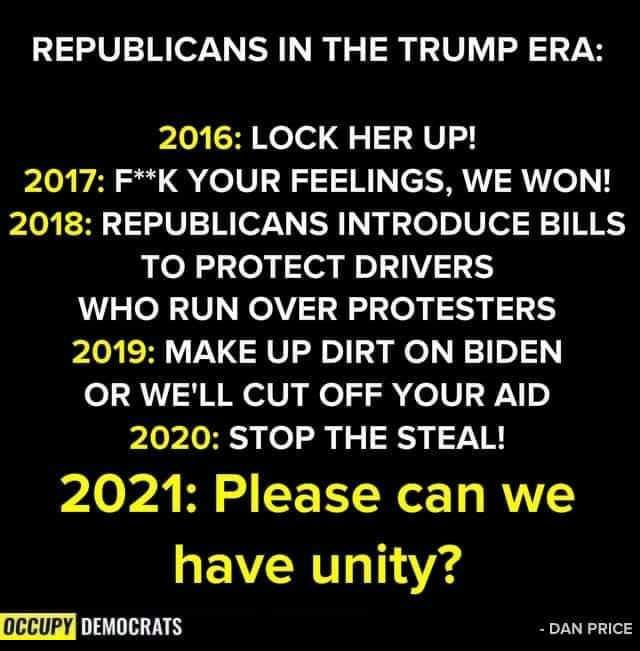 The Republicans want Unity to avoid accountability, the Democrats want it for expediency, but unity can’t come to a people who watch their laws and institutions violated with impunity. Though they’re worlds better than the Trump aberration and slightly better than the Republicans, Biden and the Dems aren’t saviors. I doubt they’ll even try to protect us from the corporatocracy eating our society, but I’m open to being surprised. In this dawn of a new administration, I hope Biden takes his cues from the people he purports to lead and gives us something worthy of the responsibility we’ve placed in him. IF he does, ‘unity’ will follow. If not, our children and grandchildren will be accountable instead… as they were so often before.