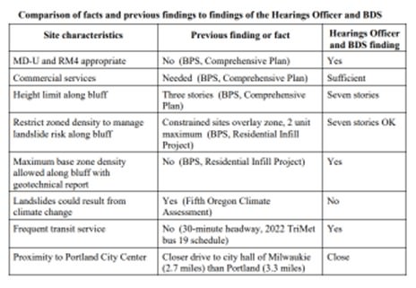 “Hearings Officer and Bureau of Development Services staff (HO&BDS) support for this proposal demonstrates the siloed dysfunction of the City’s bureaus and governance. The table lists site characteristics where BDS and the Bureau of Planning and Sustainability (BPS) have completely opposed findings or HO&BDS rely on factual errors. The resulting recommendation of the Hearings Officer, which include denying climate science and using obsolete transit schedules, creates a false justification for the proposal. City Council has the responsibility and authority to make City policy coherent and factually-based…