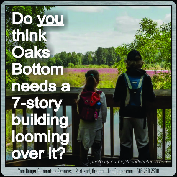 Oaks Bottom is a wildlife refuge in the center of a major city where you can watch otters play and eagles fly on the same hike. It’s only 1000’ from Tom Dwyer Automotive and there’s a dedicated walking path to get there, so it’s a great way to kill time while your vehicle is in for service. We highly recommend it! But hey, gentrification, and someone wants an exception that would let them build a 7-STORY BUILDING on the bluff overlooking Oaks Bottom. Our local neighborhood group, SMILE, is fighting back, and we put this article together to make our Sellwood neighbors aware of the issue. If you haven’t checked in with our local neighborhood jewel lately, start with this article and then get out and take advantage!
