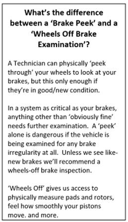 - How deep does the inspection go? Vehicles should be road-tested to expose driving issues that don’t leave visual evidence. Brake pads can be superficially examined with wheels in place, but the wheels need to be removed to be properly measured for service. Vehicles should be “put up on the rack” to relieve pressure for proper suspension check. Things like your timing belt can’t be checked directly, so the shop should have complete records of when these inaccessible components were last addressed.