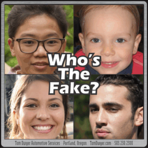 In the picture at left you see four pleasant, average folks. Nothing suspicious at all, and that’s the point… there’s no reason to suspect one of them is a fake. But which one? (tick tock… tick tock… tick tock) HA! Fooled you! THEY’RE ALL FAKE PEOPLE, produced completely from scratch by the website ThisPersonDoesNotExist.com. It’s a weird website, no text at all, in fact the only thing you see is a photo. Refreshing the page brings up another pic, one after the other. It’s an amazing new type of AI Machine learning, the Generative Adversarial Network. We couldn’t understand how it works at all, but maybe you could with an advanced mathematics/computer background and the links here, here, here, and here.