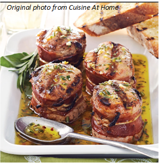 - For the pork, coat medallions with oil; season with salt and black pepper. Wrap a slice of prosciutto around each medallion and secure with kitchen string.
