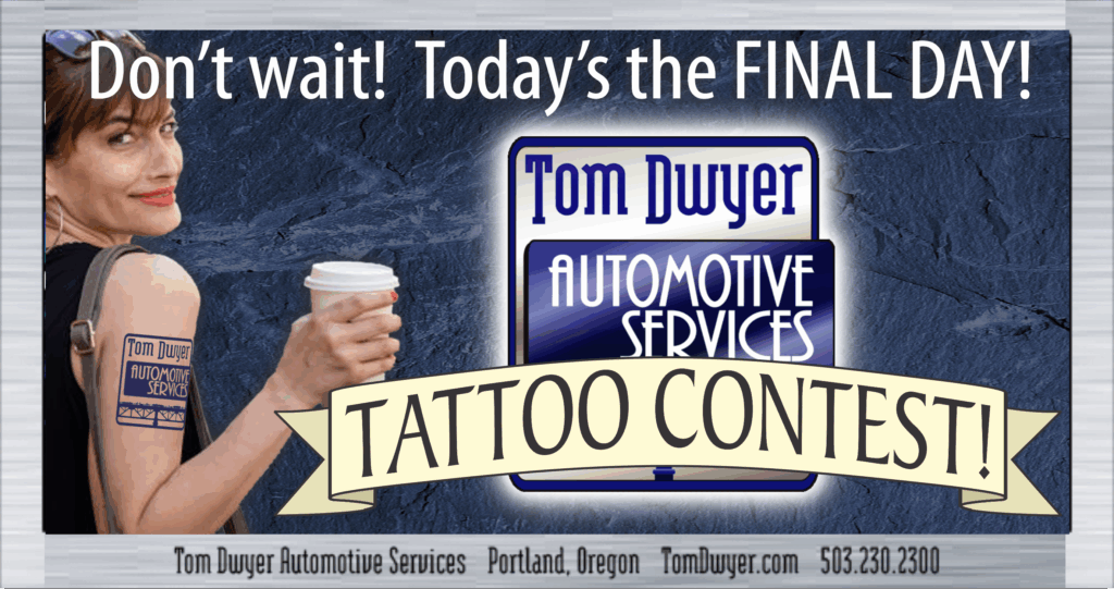 The rules are simple… Get a tattoo of our Tom Dwyer Automotive Services logo, any size, anywhere on your body, and you’ll be entered in a drawing to win a fabulous FREE CABIN AIR FILTER, a $25 value! BUT THAT’S NOT ALL! Vote for your favorite Tomtoo from our entrants below, and the winner will receive a FREE MINOR INTERVAL SERVICE.