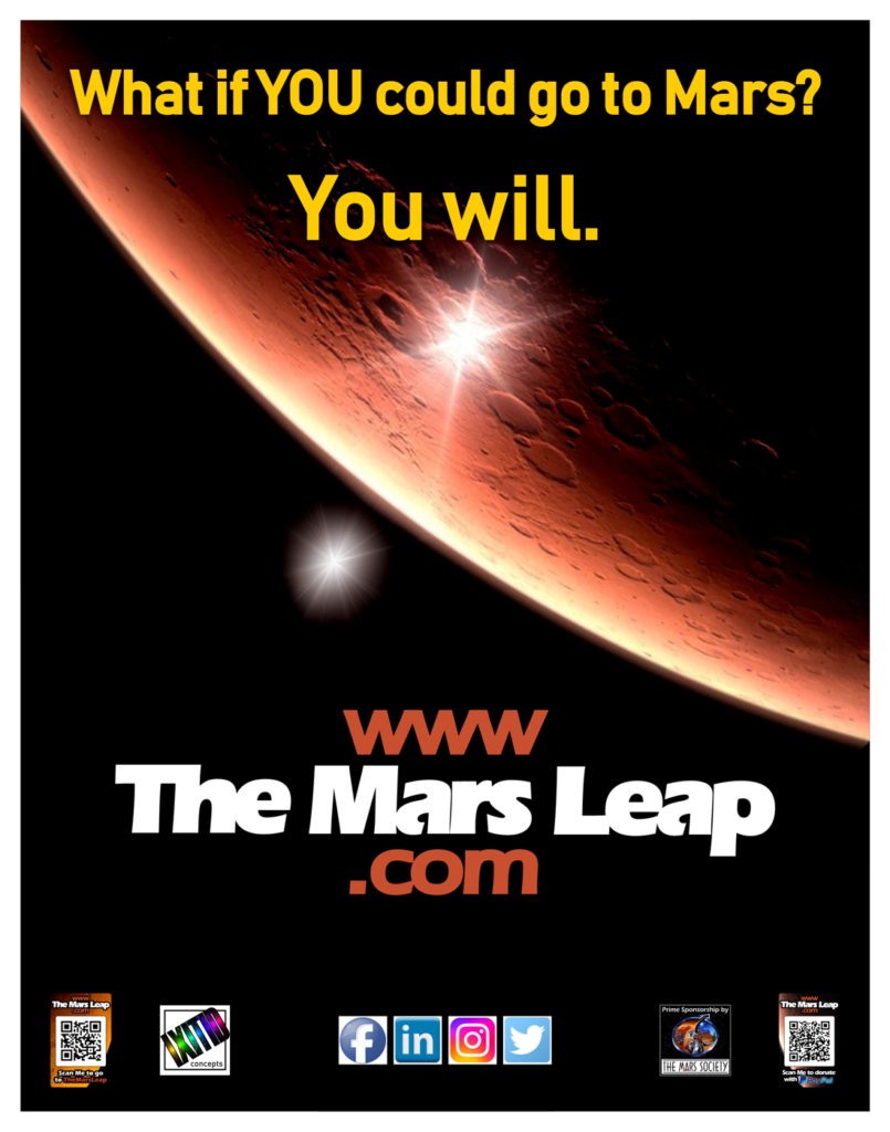 NASA hopes to be on Mars sometime in ‘the 2030’s’, China and SpaceX are planning  for 2033, but The Mars Leap will have people on Mars in the next two years … with your help. If you’d like to join the team through your time, talent, or sponsorship, we invite you to join us on the next frontier!