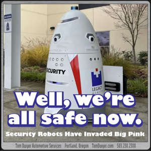 If you’ve been looking for 450-pound camera-laden Roombas to keep you safe, then we’ve got great news for you!  Portland’s Big Pink (US Bancorp Tower) just became the latest Portland company (after Legacy Health and Aloft Hotel) to put this more boring version of a Dalek to work as a security guard.  These aren’t R2D2’s with attitudes; they can’t stop people, shoot at them (thankfully!), or interdict crime in any way, but they can take pictures of it and offer remote conversation with a human security guard while the crime happens.  Utopia is here!  Check the reporting on these gigantic ambulatory salt shakers of Justice from Willamette Week, the Oregonian, or KGW.