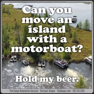 (from Gizmodo.com)- “When the land was flooded in 1923 peat bogs floated to the surface and were gradually covered with vegetation, which has kept them intact. Some of them even have mature trees flourishing on them. Because they float, the bogs are free to move around as they please. Sometimes they stay in the same place for a long time, sometimes they float down to the bridge and get stuck, blocking the passage of many of Chippewa Lake’s beautiful boaters. So, every year or so, some guys in boats belly up to the edge of the offending bog and shove it out and away from the bridge. Aluminum fishing boats, pontoons, all kinds boats run their outboard motors in unison to push the big bog away…”