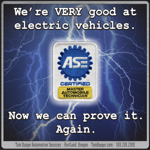 Do you own a hybrid or full-electric vehicle? Thinking of buying one? Deciding to upgrade to an electric vehicle is just the first step on a long path. Once you’re the proud owner, where will you go for the expert service you need? You might not know that until 2014 there was NO ONE in the country certified as qualified to work on electric or hybrid vehicles! It’s not that the Techs weren’t capable, but there wasn’t any such thing as hybrid/electric certification at all. The National Institute for Automotive Service Excellence (ASE, the group that certifies auto Technicians) stepped in to change that in 2015 with the first ASE Hybrid and Electric certification. We’re proud to say Tom Dwyer Automotive was an early adopter of the new certification with our first Hybrid and Electric Technician certified in July of 2016. He’s moved on since then so we didn’t have a Hybrid-certified for a while, but no longer! We’d like to congratulate Jamie Brooks, who was already a Master Certified Technician, for earning his L3 Hybrid and Electric certification this month. And we have more on the way! Here’s exactly what that means to you…