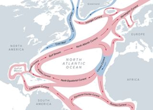 The Gulf Stream and the North Atlantic Drift are two well-known features that move warm water and associated weather from the Gulf of Mexico across the Atlantic towards western Europe. They’re just small parts of a bigger system, the Atlantic Meridional Overturning Circulation. In a massive oversimplification, it works like this-