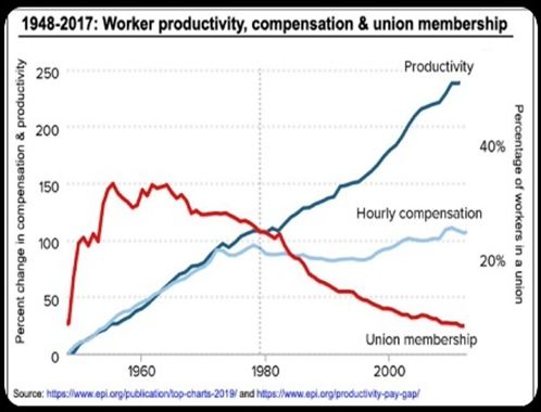 Why? Check the one that has a union membership overlay. Now, correlation isn’t causation, but the lack of someone representing wage earners at a bargaining table could easily explain why wage earners have been poorly served in bargaining over the last 50 years. And that poor service has added up to an astonishing $50 TRILLION transferred from the bottom to the top since 1975.