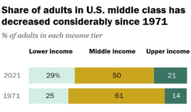 Perhaps most importantly, a rising tide of a strong national economy may not lift all boats and our personal economies may be unsustainable even if the country as a whole is doing great. Check that GDP number from our first GDP graph, smoothly and consistently rising from 1950 on. By that measure our economy has been growing, but the share of adults living in middle-class houses fell from 61% in 1971 to 50% in 2021, according to a new Pew Research Center analysis.