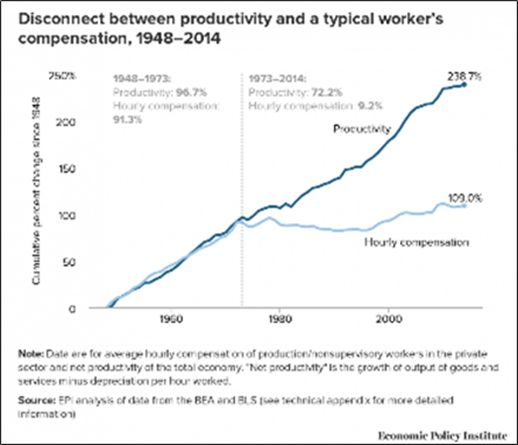 Why? Check the one that has a union membership overlay. Now, correlation isn’t causation, but the lack of someone representing wage earners at a bargaining table could easily explain why wage earners have been poorly served in bargaining over the last 50 years. And that poor service has added up to an astonishing $50 TRILLION transferred from the bottom to the top since 1975.