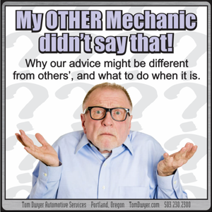 It would be unfair either to expect a blank check for diagnostic time or to charge you for time we don’t use. (Portland auto repair icon Harold Dick prospered for 40 years under a different model; he’d fix your car, you’d pay whatever he said, and if you didn’t like it he’d never touch your car again.) If we see the need for diagnostic time WE’LL TELL YOU HOW MUCH WE EXPECT CLEARLY AND IN ADVANCE, and if we need to go further we will CALL YOU FIRST. If we didn’t use all the time you authorized we’ll adjust your bill appropriately. Yes, we need to be paid, but no, we don’t need or want to be abusive about it.