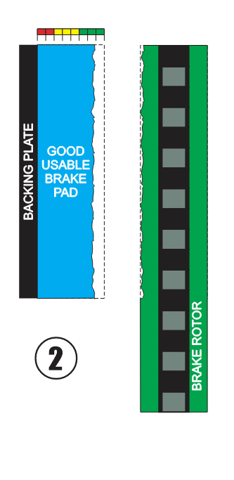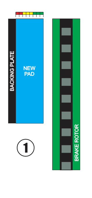 Drawing 1 is your vehicle’s brake system when it’s brand new. The pads and rotors are absolutely smooth and the pads are at full thickness (about 8-10mm for most cars. The little graph above the pad shows the wear depth.) Wear rates vary by vehicle, driving style, and pad composition, but it’s pretty normal to lose about a millimeter of pad thickness for every 4000 miles or so of driving.
