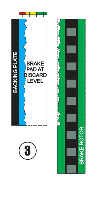 Drawing 4 is your worst-case scenario. The squealer tab has been ground off so there’s no warning anymore, and the pad itself is almost gone. “Metal on metal” is a death sentence for your brakes as the metal of the backing plate grinds into the rotor. This is UNSAFE because your brakes won’t work consistently when you absolutely need them, and EXPENSIVE because you’re doing massive damage every time you press the brake pedal. DON’T EVER GET IN THIS SITUATION!