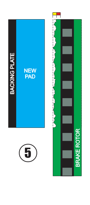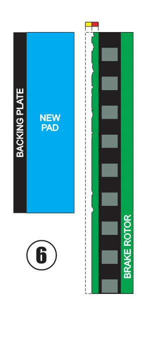 Drawing 5 is the brake system of a relieved driver. The pads have been replaced and are full thickness and smooth, but you’ll notice that the rotor still has a groove pattern from the last set of pads. The brakes will work just fine but it will take a while for the pattern on the rotor to engrave itself perfectly into the material of the pads. When we tell you “make a couple hundred slow, gentle stops to let the brakes settle in”, this is what we’re trying to do… get those grooves matching as gently as possible.