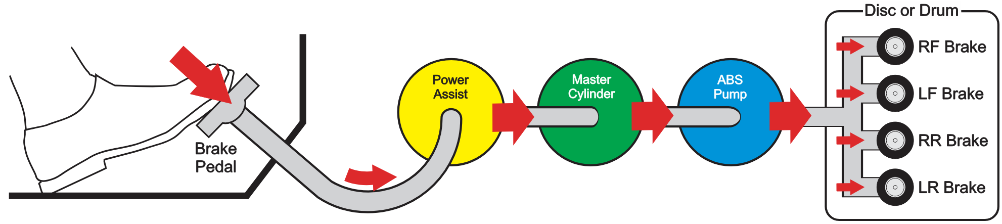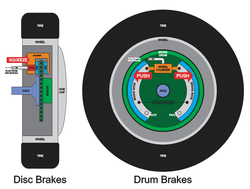 - Disc or Drum brakes– After going through the Power Assist, Master Cylinder, and ABS Module, the force from your brake pedal is distributed to brakes at each of your four wheels.