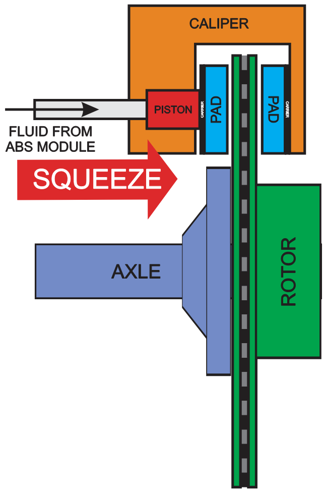 Let’s look a little closer at that disc system. The first thing to notice is our drawing is wrong… we’ve shown the gap between the pads and rotor much larger than the actual gap, because they’re actually set as close as possible to the rotor so there’s the absolute minimum time between pressing the pedal and the actual braking contact. In reality, they’re so close that it’s impossible to slip a piece of paper in the gap! Also, no braking system on any car looks like this. It’s a schematic diagram to show how the system works, so your vehicle will absolutely look different than this! But it’s enough to tell you about all the basic components.